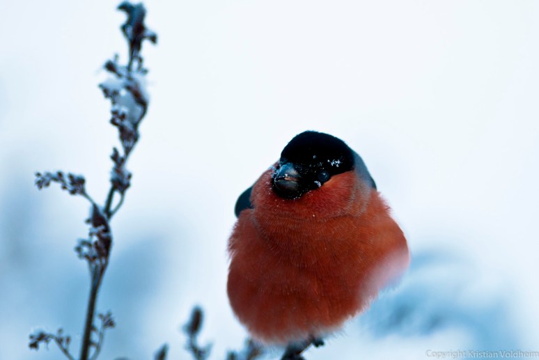 Bildet er tatt i jula i fjor, gjennom kjøkkenvinduet hjemme hos mine foreldre. Dompapen trosset – 28 og spiste frø fra syrinen utenfor kjøkkenet.