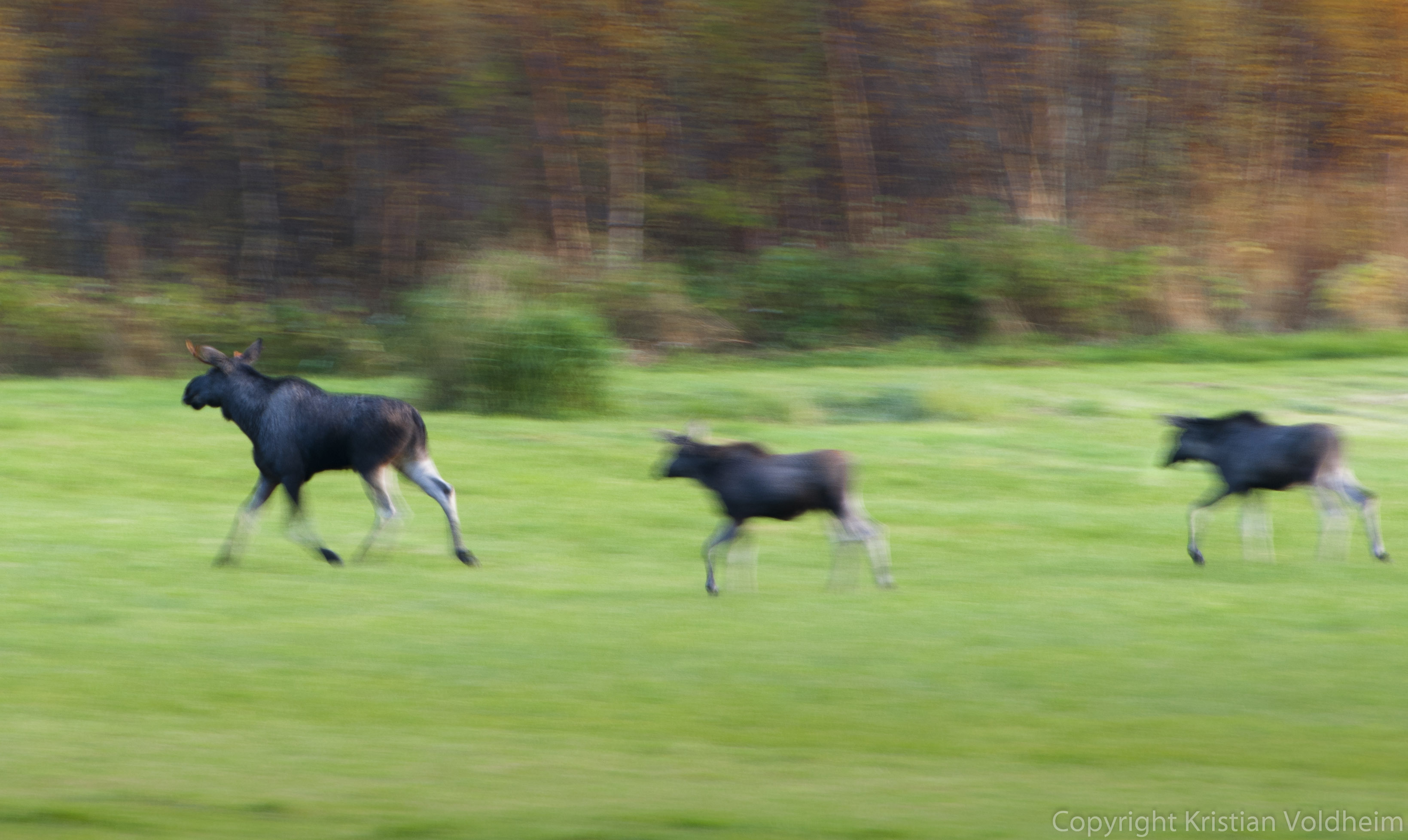 – Elg er fotografert på 1/10 sek med brennvidde 400 mm (I dette tilfellet var hastighet på elgen veldig lav, og det var nesten umulig å få fram panoreringseffekten, selv med 1/10 sek).